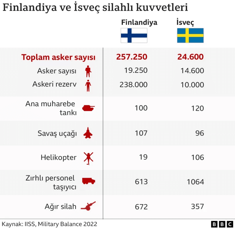 İsveç’in askeri kapasitesi 57.000 kişi ile çok daha küçük. Ancak 2010’da askıya aldığı zorunlu askerliği 2018’in başında geri getirdi ve 6.000 kadar olan mevcut asker sayısı 2025’te 8.000’e çıkacak.