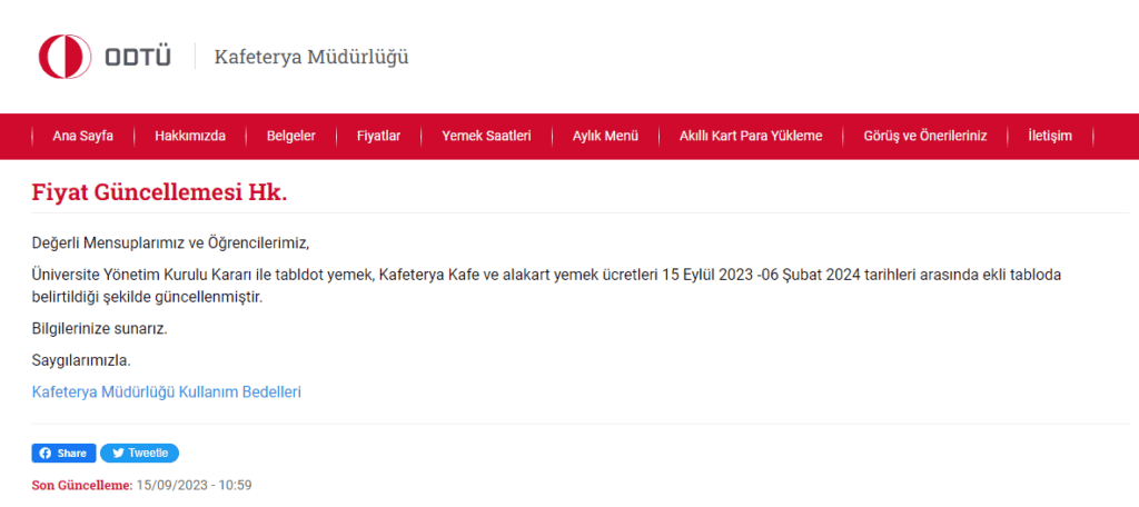 ODTÜ’de öğrenci yemekleri 8,5 liraydı. Dün yapılan bir duyuruyla bu tutar 15 liraya yükseltildi. Yani, yaklaşık yüzde 76 oranında zam yapıldı.