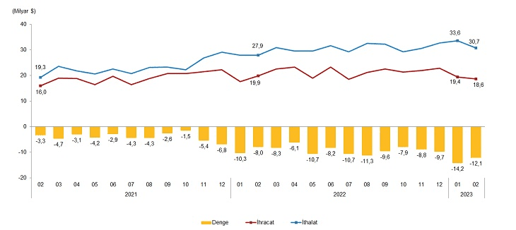 Ocak-şubat döneminde dış ticaret açığı yüzde 44,1 artarak 18 milyar 270 milyon dolardan, 26 milyar 328 milyon dolara yükseldi. İhracatın ithalatı karşılama oranı Ocak-Şubat 2022 döneminde yüzde 67,2 iken, 2023’ün aynı döneminde yüzde 59,1’e geriledi.