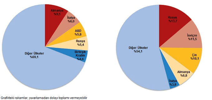 Ocak-şubat döneminde ithalatta ilk sırayı Rusya Federasyonu aldı. Rusya Federasyonu’ndan yapılan ithalat 9 milyar 216 milyon dolar olurken, bu ülkeyi sırasıyla; 7 milyar 863 milyon dolar ile İsviçre, 6 milyar 660 milyon dolar ile Çin, 3 milyar 888 milyon dolar ile Almanya, 2 milyar 296 milyon dolar ile ABD izledi. İlk beş ülkeden yapılan ithalat, toplam ithalatın yüzde 46,5’ini oluşturdu.