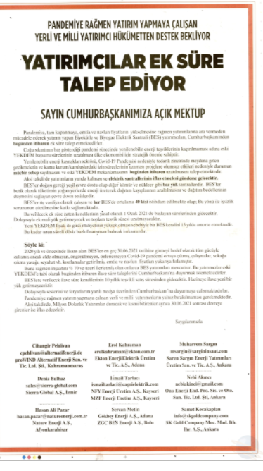 Kendilerini ‘pandemiye rağmen yatırım yapmaya çalışan yerli ve milli yatırımcı’ olarak tanımlayan Biyokütle ve Biyogaz Elektrik Santrali (BES) yatırımcıları, Sabah gazetesine verdikleri ilanla Cumhurbaşkanı ve AKP Genel Başkanı Recep Tayyip Erdoğan’a seslendi. Açık mektupta, “Pandemiye rağmen yatırım yapmaya çalışan yerli ve milli yatırımcı hükümetten destek bekliyor, yatırımcılar ek süre talep ediyor” denildi.