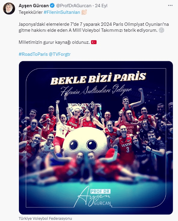 “Teşekkürler File’nin Sultanları. Japonya’daki elemelerde 7’de 7 yaparak 2024 Paris Olimpiyat oyunlarına gitme hakkı elde eden A Milli Voleybol takımımızı tebrik ediyorum. Milletimizin gururu oldunuz.”