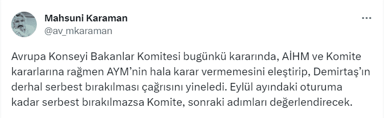 “Avrupa Konseyi Bakanlar Komitesi bugünkü kararında, AİHM ve Komite kararlarına rağmen AYM’nin hala karar vermemesini eleştirip, Demirtaş’ın derhal serbest bırakılması çağrısını yineledi. Eylül ayındaki oturuma kadar serbest bırakılmazsa Komite, sonraki adımları değerlendirecek.”
