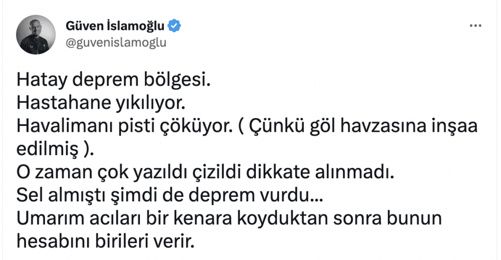 “Hatay deprem bölgesi. Hastahane yıkılıyor. Havalimanı pisti çöküyor. (Çünkü göl havzasına inşaa edilmiş.) O zaman çok yazıldı çizildi dikkate alınmadı. Sel almıştı şimdi de deprem vurdu. Umarım acıları bir kenara koyduktan sonra bunun hesabını birileri verir.”