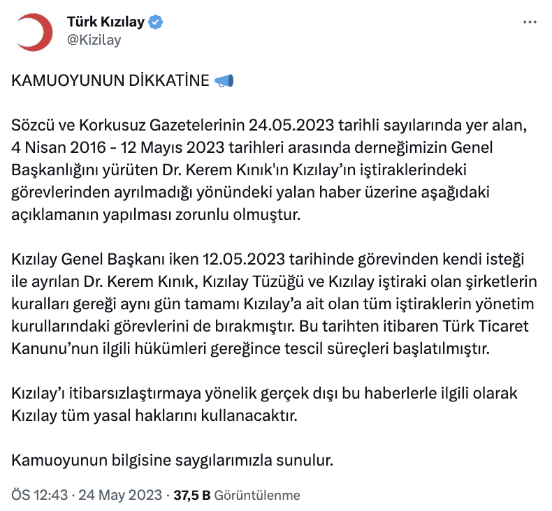 “KAMUOYUNUN DİKKATİNE Sözcü ve Korkusuz Gazetelerinin 24.05.2023 tarihli sayılarında yer alan, 4 Nisan 2016 – 12 Mayıs 2023 tarihleri arasında derneğimizin Genel Başkanlığını yürüten Dr. Kerem Kınık’ın Kızılay’ın iştiraklerindeki görevlerinden ayrılmadığı yönündeki yalan haber üzerine aşağıdaki açıklamanın yapılması zorunlu olmuştur. Kızılay Genel Başkanı iken 12.05.2023 tarihinde görevinden kendi isteği ile ayrılan Dr. Kerem Kınık, Kızılay Tüzüğü ve Kızılay iştiraki olan şirketlerin kuralları gereği aynı gün tamamı Kızılay’a ait olan tüm iştiraklerin yönetim kurullarındaki görevlerini de bırakmıştır.