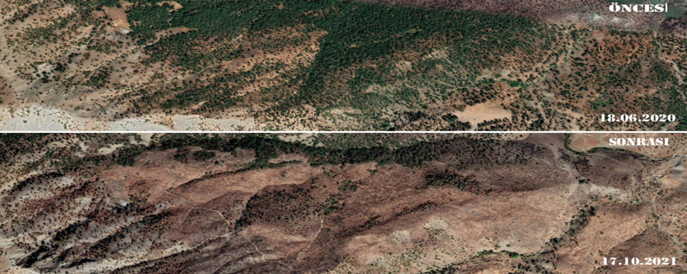 Şırnak Cezaevi’nin kuzeydoğusunda yer alan bir bölgeden 8 Ekim 2020 ve 17 Ekim 2021 tarihlerinde çekilen iki ayrı uydu fotoğrafında, geniş bir ormanlık alanın tamamen yok edildiği görülüyor.