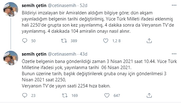 Bildiriye imza atan başka isimlere tepkisi nedeniyle imzasını koymadığını belirten emekli amiral Semih Çetin, Halk Tv’de katıldığı Açıkça programında, WhatsApp grubuna gelen metnin tarihinin 6 Nisan 2021 olduğuna dikkati çekmişti. Çetin, bugün bildiriye imza atan bir emekli amiralin söz konusu metinde değişiklikle “Yüce Türk Milletine” ifadesinin eklenerek 3 Nisan 2021 saat 22.50’de onaya sunulduğu bilgisi verdiğini aktardı. Söz konusu metinin Veryansın TV’de ise saat 22.54’te yayımlandığına işaret eden Çetin, “Hıza bak” dedi.