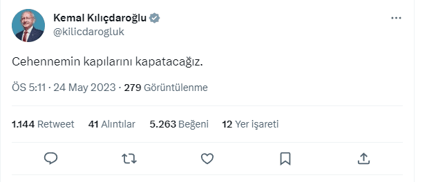 Millet İttifakı’nın cumhurbaşkanı adayı Kemal Kılıçdaroğlu, Twitter’dan “Cehennemin kapılarını kapatacağız.” paylaşımı yaptı.