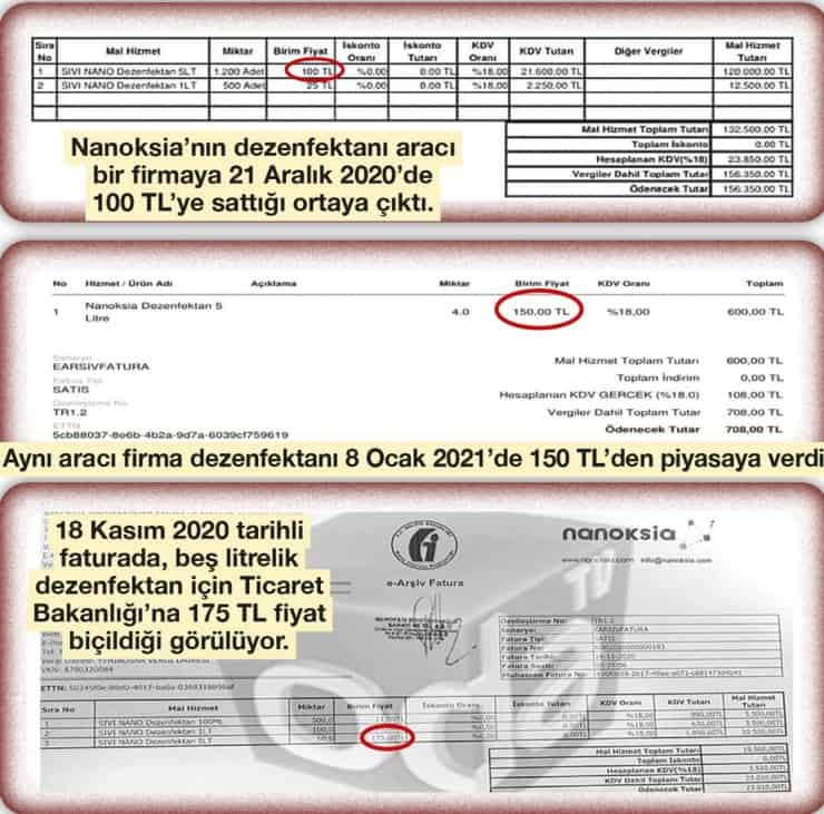 Sözcü’den İsmail Saymaz’ın haberine göre Nanoksia’nın bakanlığa 18 Kasım 2020’de 175 liraya fatura ettiği 5 litrelik dezenfektanı, aracı bir firmaya 21 Aralık 2020’de 100 liraya satmış.