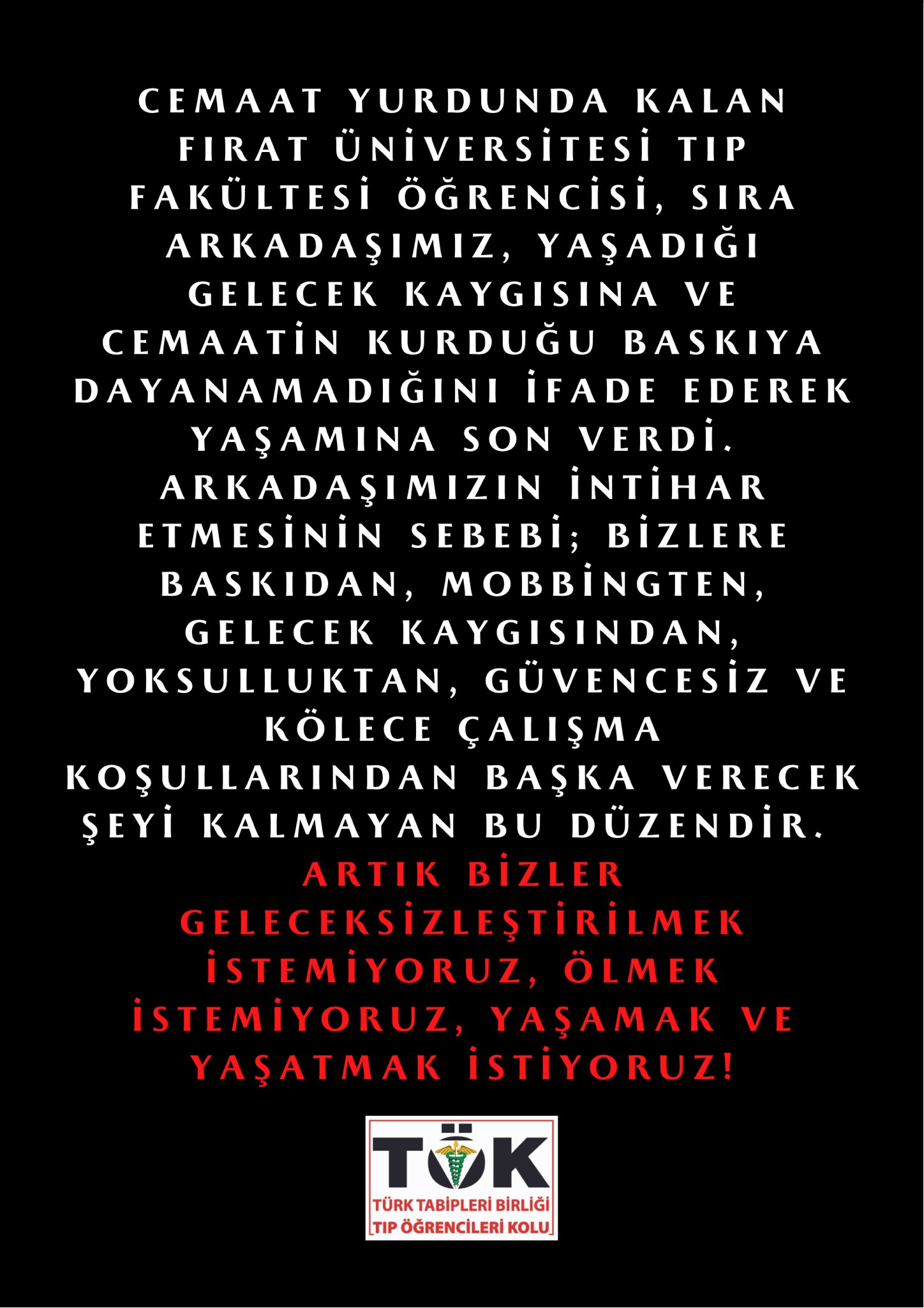 Evrensel’in haberine göre; kaldığı cemaat yurdunda cansız bedeni bulunan 20 yaşındaki Enes Kara’nın bıraktığı intihar notunda “Herkes doktorluktan kaçıyor, çünkü mobbing var, uzun süreli nöbetler var, hastadan şiddet görme ihtimali var, köle gibi çalışıyorsunuz, ben böyle bir gelecek istemiyorum… Bulunduğum cemaat yurdunda namaz kılma ve cemaatin dersine katılmak zorunlu, verdikleri kitapları okumak zorunlu, kendim müslüman değilim, ailem bilmiyor, buradan ayrılmak istediğimi söylediğimde hayır cevabını aldım” gibi ifadeler kullandığı belirtildi.