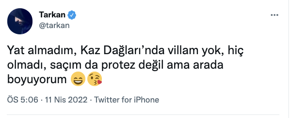 Twitter hesabından açıklama yapan Tarkan, “Yat almadım, Kaz Dağları’nda villam yok, hiç olmadı, saçım da protez değil ama arada boyuyorum” ifadelerini kullandı.