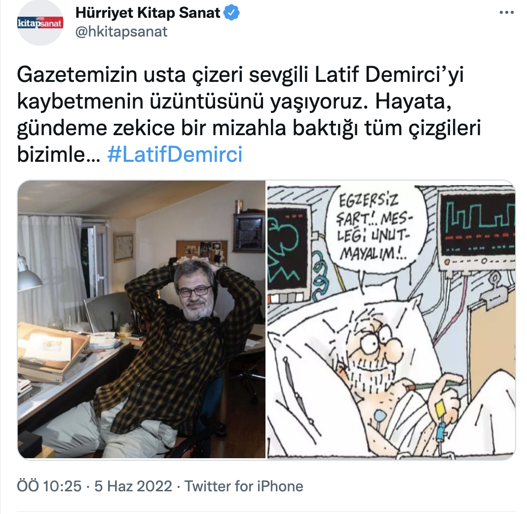 Hürriyet Kitap Sanat Twitter hesabından “Gazetemizin usta çizeri sevgili Latif Demirci’yi kaybetmenin üzüntüsünü yaşıyoruz. Hayata, gündeme zekice bir mizahla baktığı tüm çizgileri bizimle” paylaşımına yer verildi.