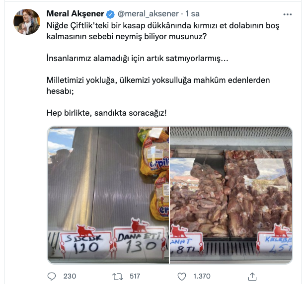 Akşener Twitter hesabından yaptığı paylaşımda, “Niğde Çiftlik’teki bir kasap dükkânında kırmızı et dolabının boş kalmasının sebebi neymiş biliyor musunuz? İnsanlarımız alamadığı için artık satmıyorlarmış… Milletimizi yokluğa, ülkemizi yoksulluğa mahkûm edenlerden hesabı; hep birlikte, sandıkta soracağız!” düşüncesini dile getirdi.