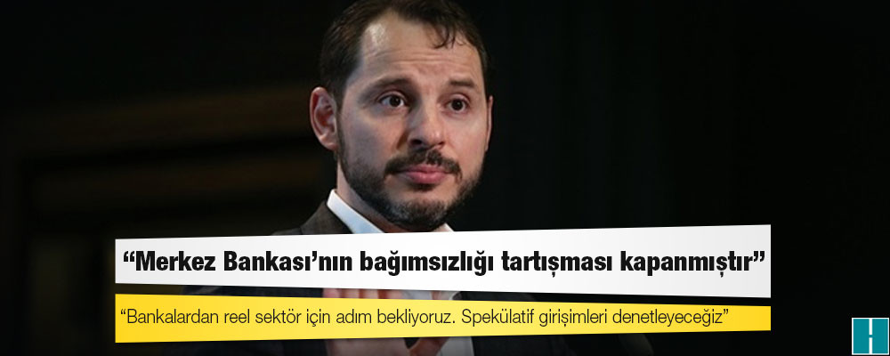 Merkez Bankası’nın faiz kararının ardından bankanın bağımsızlığı ile ilgili tartışmaların kapandığını söyleyen Bakan Albayrak, “Bundan sonra bu konudaki tartışmaların hiçbir gerçekliği ve karşılığı yoktur, çok net art niyetlidir. Bu tür spekülasyonların ve tartışmaların küresel piyasalarda karşılığı olmayacaktır” dedi.