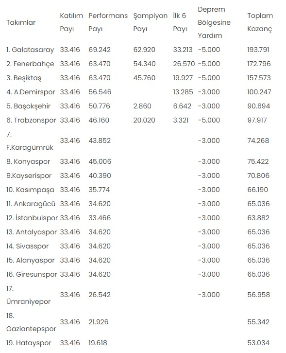 * İlk 6 payında lig şampiyonu Galatasaray 33 milyon 213 bin lira, lig ikincisi Fenerbahçe 26 milyon 570 bin lira, lig üçüncüsü Beşiktaş 19 milyon 927 bin lira, lig dördüncüsü Adana Demirspor 13 milyon 285 bin lira, lig beşincisi Başakşehir 6 milyon 642 bin lira ve lig altıncısı Trabzonspor 3 milyon 321 bin lirayla ödüllendirildi.