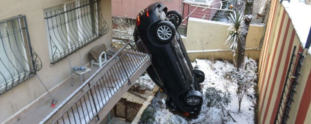 3 metre yükseklikten düşen otomobil bahçede dik bir şekilde kaldı. Balkondan destek alarak dik duran otomobildeki kadın sürücü kazayı gören vatandaşlar tarafından araç içinde çıkartıldı. Kazayı gören bina sakinleri polise ve sağlık ekiplerine haber verdi. Kısa bir süre sonra olay yerine gelen sağlık ekipleri yaralı sürücüyü hastaneye kaldırdı. Polis ekipleri aracın düştüğü yerde dubalarla güvenlik önlemi aldı.